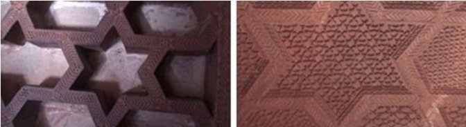 «ستاره ی داود: ستاره ی شش گوشی که از دو مثلث در هم فرورفته ی معکوس پدید می آید و یک سمبل مذهبی هندوان است که قدرت را تداعی می کند و نمایه ی بسیار مهمی در تدارکات نمایشی ادیان مختلف است. این علامت بر سر در بسیاری از مکان های اسلامی هند نیز دیده می شود که از آن جمله در قلعه ی کهنه ی دهلی، مقبره و مسجد همایون، فاتح پور سیکری و مکان های متعدد دیگر». (پرادوما کومار شارما، معماری هند و اسلامی در دهلی و آگرا، ص ۱۸، متن اصلی)