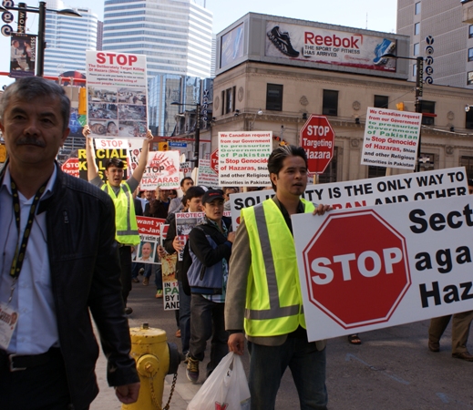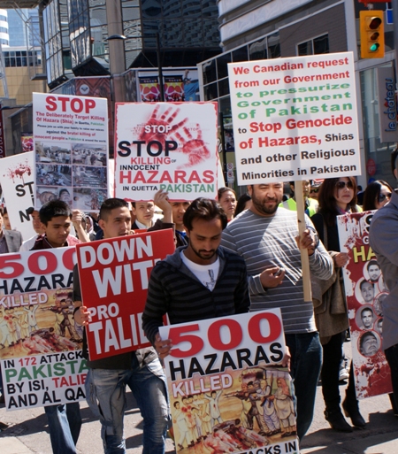روز ششم می، هزاره های مقیم تورنتو و حومه آن بخاطر اعتراض از قتل عام مردم هزاره در کویته پاکستان راه پیمایی اعتراضی را به راه انداختند. راه پیمایی ساعت 3:30 از نقطه مرکزی شهر "دندس سکوار" آغاز شد و تا کوینس پارک، جاییکه عمارت پارلمان ولایت آنتاریو موقعیت دارد، ادامه یافت.