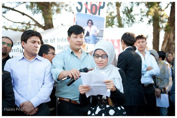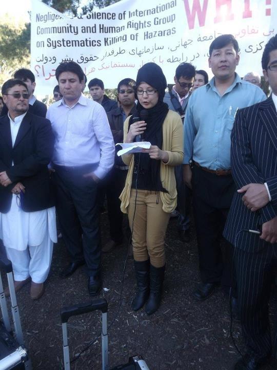 خانم فریده حسین، محصل رشتۀ روابط بین الملل و ژورنالیزم در دانشگاه کانبرا، که گرداننده گی این بخش را به عهده داشت هدف از تجمع آنروز را حمایت از حق زندگی برای انسانها در پاکستان خواند؛ ایشان با اشاره به کشتار هدفمندانۀ هزاره ها در چند سال اخیر در شهر کویته از قانون اساسی مصوبۀ سال 1956 پاکستان یاد آوری نمود که مطابق با آن تمامی تابعین این کشور از حقوق مساوی برای زندگی، امنیت، تجربۀ باورها وعقاید خویش برخوردارند و هیج تبعیضی نسبت به نژاد و مذهب شان روا نیست؛ وی گفت با توجه به این قانون و شدت گرفتن تبعیض و کشتار در برابر هزاره ها درین کشور، قطعا میتوان ابراز داشت که دولت این کشور از انجام وظایف خویش برای تامین امنیت جانی باشندگان این کشور نا کام مانده است و جامعۀ جهانی باید به وطیفۀ خویش برای حفاظت زندگی هزاره ها در پاکستان اقدام نمایند.