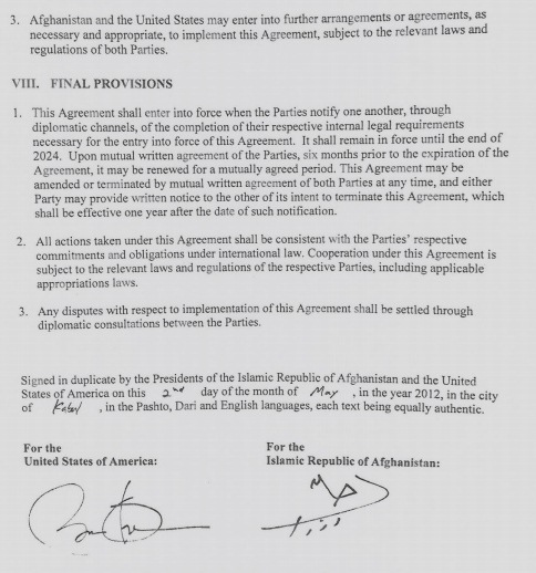 اولا:همان طوریکه همه ای میدانم این پیمان بعد ازآورده شدن دوخواسته ای بسیار به ظاهر سطحی وپیش افتاده ای حکومت افغا نستان بامضاءرسید، یکی توقف حملات شبانه ای نیروهای آمریکائی وناتو،دوم واگذاری مسؤلیت زندان بگرام بدولت افغانستان. حامد کرزی وتیم تمامیت خواه اش تا این دوخواسته را بالای آمریکا تحمیل نکردند حاضرنشدند که این پیمان را امضاءکنند؛ این مسئله خود سؤال برانگیز است که چرا این دومسأله آنقدر مهم بودکه سرنوشت آینده ای مملکت وامنیت مرزی؛ جغرافیائی وثبات سیاسی با آن گره خورده بود؟آیا این حرف که کنترل زندان بگرام توسط آمریکا ئیها نقض حاکمیت ملی است حرفی درست است؟ اگراین استدلال درست باشد پس حضورنیروهای نظامی وسیاسی بیش ازچهل کشور خارجی درافغانستان بطریق اولی باید ناقض حاکمیت افغانستان باشدوحال اینکه خودحاکمیت این حرف را قبول نداردوآن را به هیچ وجه ناقض حاکمیت نمیداند پس بنا براین معلوم است که پشت این تقلا اهداف وانگیزه های سیاسی تیم حاکم وعمال آی اس آی درداخل ارگ ریاست جمهوری نمی خواهند که برادران ناراضی کرزی تحت کانترل مطمئن باشند تازمینه ای رهائی وفرار شان مساعد گردد وبتوانند آب را به نفع تمامیت خواهان تیره کرده وزمینه ای فشاربیشتر سیاسی ارگ نشینان را بالای غرب ونیروهای مخالف داخلی فراهم بسازند که طالبان را به عنوان نیروی قدرت مند وبا صطلاح فاژیست ها مقاومت ملی بپیزیرند وآنها را دردولت به عنوان نیروی مشروع داخل نمایند زیرامردم افغانستان هنوز فرارپنجصد طالب وتروریست را ازپیش چشم نیروهای امنیتی اززندان سرپوزه قندهار فراموش نکرده اند وهمین طور درسال 2008میلادی حدود 900نفرازهمین زندان بایک انفجارهماهنگ شده ای ازقبل درمقابل درزندان فرارکرد ند که اکثریت شان ازبرادران ناراضی کرزی بودندوموارد دیگری درکابل وغزنی اتفاق افتاد که همه نشان دهنده پلان ها ی تیم حاکم است.