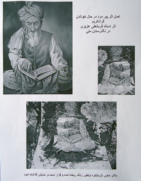 “A Man Reading Quran, Without Knowing the Meaning” is not an original work, but is Mohsen Taasha’s interpretation from another painting exposed in the National Gallery of Afghanistan that is called “A Man Reading Holy Quran”.