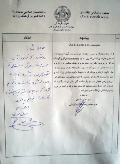 In midday June 21st 2012 before the opening of the exhibition “Study of View” supported by Documenta in Kabul, the Minister of Information and Culture and some of his men rushed to the exhibition venue where they used violence against the artists and applied restrictions against works of three artists, all from the minor ethnic Hazara; Mohsen Taasha, Amin Taasha and Azizullah Hazara. The Minister and his men banned four art works in total and confiscated them all.