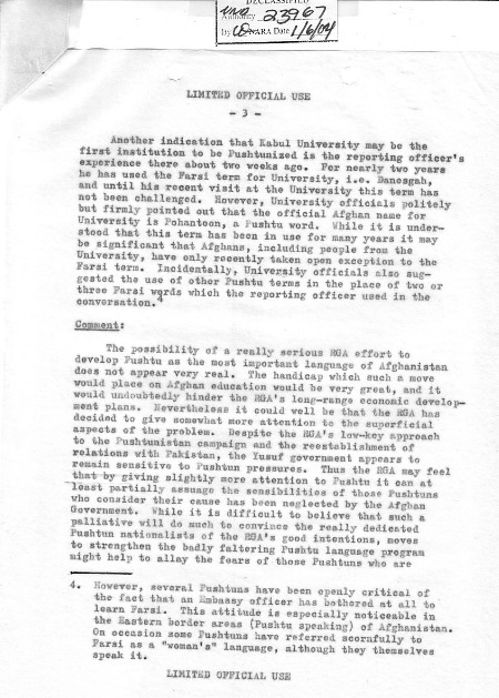 2. این بحث معیاری پشتونها درباره موقعیت پشتو میباشد. کارمند گزارشگراز ذکر حقایق شرم آور بیشترخودداری کرد که: درفامیل شاهی تعداد اشخاص محدودی وجوددارند که پشتو میدانند، بخصوص در بین نسل جوانترآنها.