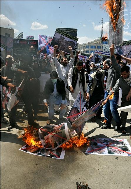 جالب است، پارسال که حزب همبستگی علیه جنایات رژیم سفاک ایران در کابل تظاهرات راه انداخت و بسوی لانه جاسوسی رژیم تخم گندیده و رنگ سرخ و سیاه پرتاب کرده، شما از تظاهرکنندگان خواستید که به سفارت حمله کرده آنرا به آتش بکشند. چطور است که امروز مخالف به آتش زدن تصاویر سمبول های جنایت و بربریت و خیانت میشوید؟