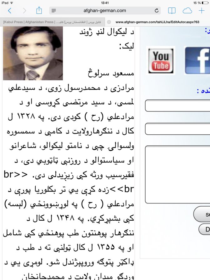 عیب بزرگ آنست که یک¨پشتون پشاوری تازمانیکه در کرسی های بلند حزبی ودولتی قرار میداشته باشد پرچمی اصولگرا وانقلابی جلوه میکند ولی بمجردکه از نردبان قدرت وکرسی دولتی وحزبی بزمین افتید با نوشتن چرندیات ودشنامنویسی ها هم آواز وهمصدای گلبدین وقریب الرحمن سعید وطارق بزگر میشود.