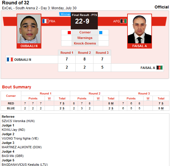 امشب به وقت لندن اجمل فیصل بوکسور 52 کیلوی افغانستان مقابل بوکسوری از کشور فرانسه قرار گرفت که در سه دور، رقابت را به حریف خود واگذار کرده و شکست خورد. او در دور اول دو امتیاز بدست آورد، حریف او هفت امتیاز. در دور دوم دو امتیاز و حریف فرانسوی هشت امتیاز. در دور سوم او پنج امتیاز بدست آورد و حریف فرانسوی هفت امتیاز. در مجموع او با نه امتیاز در مقابل بیست و دو امتیاز شکست خورد. این دومین شکست المپیکی های افغانستان است. روز گذشته اجمل فیض زاده جودوکار افغانستان در 17 ثانیه ضرب فنی شد و با المپیک خداحافظی کرد.