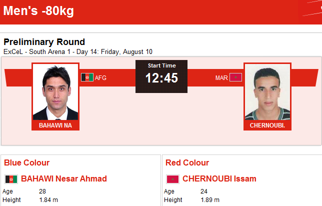 نثار احمد بهاوی این تکواندو کار 28 ساله روز جمعه 10 آگوست ساعت 12.45 به وقت لندن، در وزن 80 کیلو گرم مقابل حریفی از کشور مغرب قرار خواهد گرفت.