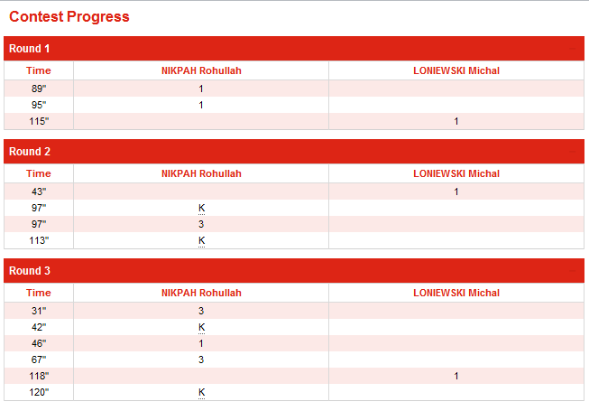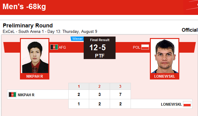 روح الله نیکپی توانست در نخستین دیدار خود با امتیاز 12 بر 5 از سد رقیب پولندی خود بگذرد. این نخستین پیروزی افغانستان در المپیک لندن است. با پیروزی قاطع روح الله نیکپی، فردا جمعه نثار احمد بهاوی به آسانی می تواند از سد حریف مراکشی خود بگذرد.