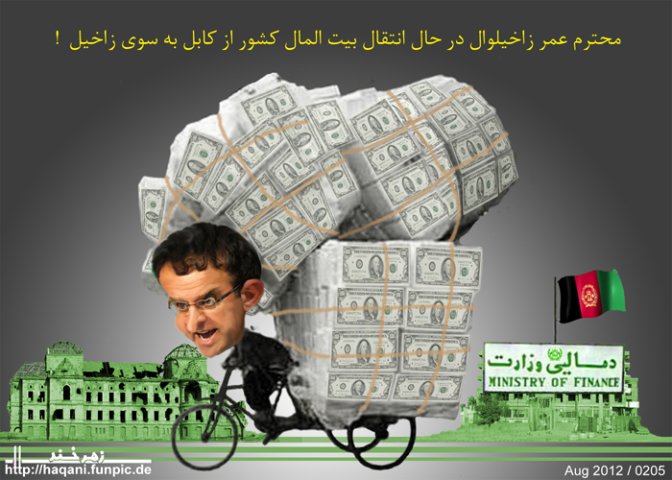 محترم زاخیلوال این فرزند صدیق وطن که در امانتداری و حفظ و حراست سرمایه های ملی کشور به حق شهرت نیکی کمایی کرده و ازینرو مورد اعتماد مطلق جلالتماب کرزی قرار دارد با اطلاع از وضعیت نا هنجار ادارات دولتی و خطر به چپاول رفتن خزانه دولت و بیت المال کشور به هراس افتاده و با استفاده از نبوغ ذاتی شان در صدد چاره جویی برآمده و برای نجات آن از دستبرد چپاولگران تصمیم به انتقال آن به سمت زاخیل گرفتند.