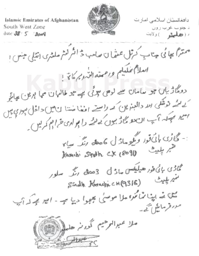 Document letter: Taliban leaders have close relationship with Military Intelligence of Pakistan