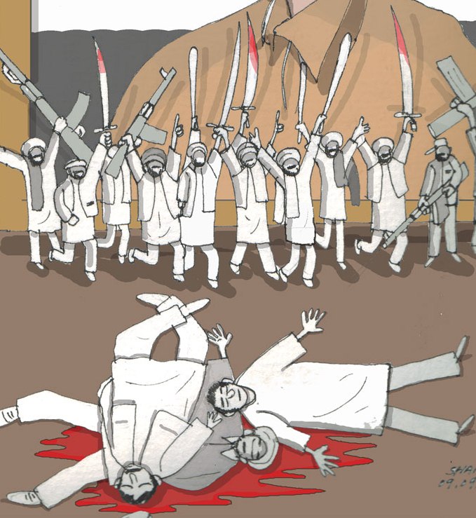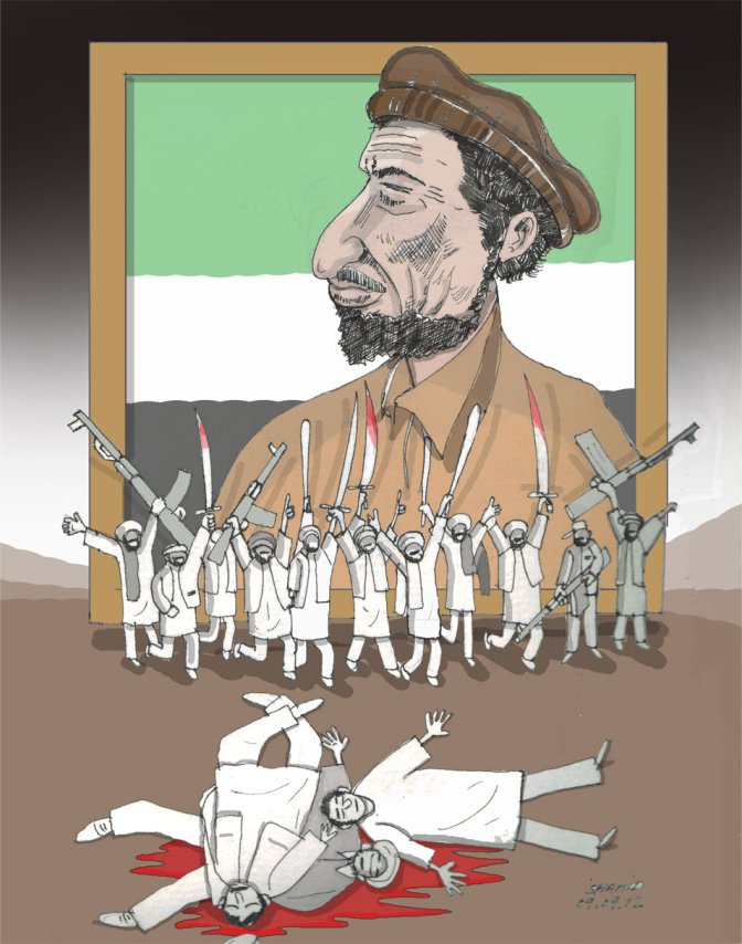 مسعود با ما جنگیده - پوز ما را به خاک مالیده و ما را در جهان رسوا و بیهویت ساخته/ نمیگذاریم - تا چنین کاریکاتور رسم نکنیم - آرام ما نمیگیریم.