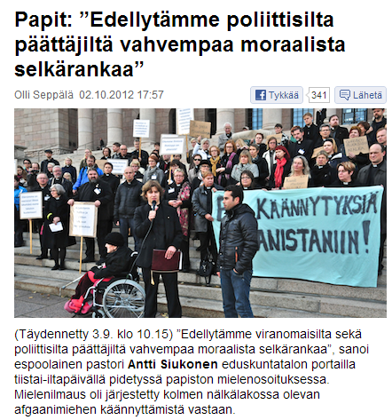 جمعی از این کشیشان روز دوم ماه اکتبر در کنار این سه پناهجوی افغانستانی مقابل پارلمان فنلاند قرار گرفتند و به نقد سیاست های ضد مهاجرتی دولت این کشور پرداختند.