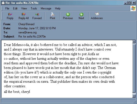 حالا شگفتی ندارد که امروز و صبا شما هم از سوی سرجلادان شیعه و تاکید خاد و واواک موظف باشید چیزی با ترکیب عموماً خادی- جهادی بر ضد «راوا» تقدیم «جبهه ملی» کنید. «آی.اس.آی» که موفق نشد باصدور چندین سازمان و نشریه «زنانه» و منجمله «پیام زن مسلمان» در پاکستان، اعتبار و شهرت و قاطعیت «راوا» را مخدوش سازد. نتیجه کوشش شما را خواهیم دید که آبرویتان را خواهد برد یا نه.