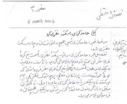 تفصیل خبر: نسخه جعلی نسخه خطی با عنوان "نسخه خطی، نخستین نشریه خطی دایکندی در عصر کامپیوتر، شماره اول، سال سوم، مورخ 30 دلو 1386 در ولایت دایکندی نشر گردید.