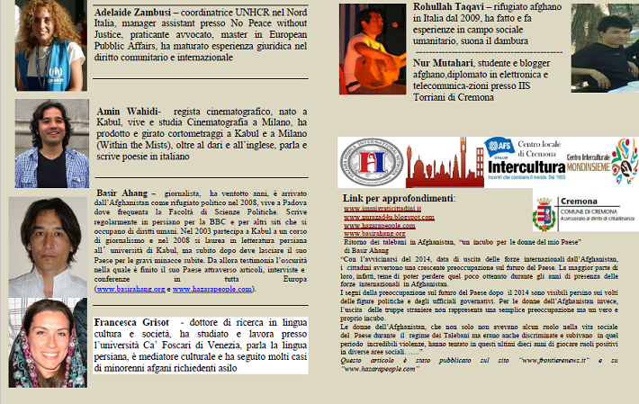 به تاریخ پنجم ماه دسامبرسال روان میلادی، کانفرانسی با عنوان "افغانستان آنسوی جنگ، کشوری با فرهنگ و تاریخ غنی" درشهرکریمونه، درشمال ایتالیا برگزار میگردد. دراین کانفرانس که با حضورمسئول ساحوی کمیساریای عالی سازمان ملل متحد درامورپناهندگان، درشمال ایتالیا برگزارمیگردد، جمعی از ژورنالیستان و فعالان حقوق بشرافغانستانی وایتالیایی، درباره وضعیت کنونی افغانستان وچالش های فراروی این کشورپس از سال 2014 صحبت مینمایند.