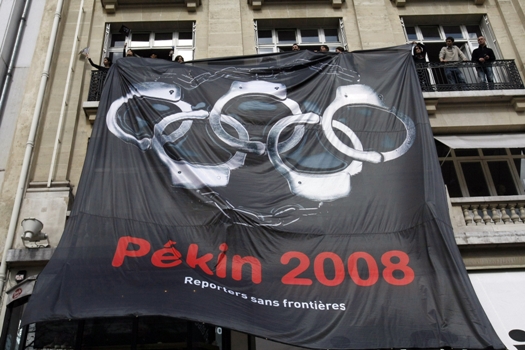گزارشگران بدون مرز موفق شد چهار پرجم بزرگ را با لوگوی پکن ٢٠٠٨ را که مزين به پنج دستبند به جای حلقه های المپيک بودند، در مسير عبور مشعل بر روی برج ايفل، در خيابان شانزه ليزه ، بر روی پل هنرها، کليسای نتردام و بر بالای ساختمان کميته ملي المپيک فرانسه نزديک استاديوم شارلتي که مراسم اختاميه عبور مشعل برگزار مي شد، برافرازد.