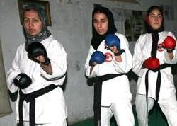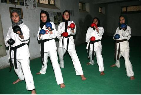 زنان کمربند سياه در حال تمرين در باشگاه کاراته شوتو کان در کابل.