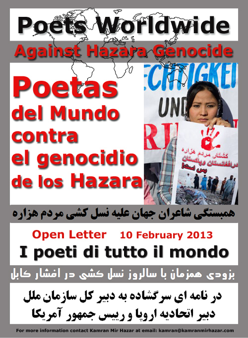 کابل پرس?: بزودی صدها تن از شاعران جهان همزمان با سالروز نسل کشی در منطقه ی افشار شهر کابل، در حرکتی هماهنگ، نامه ای سرگشاده را خطاب به دبیر کل سازمان ملل متحد، دبیر اتحادیه ی اروپا و رییس جمهور آمریکا منتشر خواهند کرد. در این نامه، شاعران جهان ضمن اعلام همبستگی با مردم هزاره و محکومیت دو قرن ارتکاب شدید ترین جنایات ضد بشری علیه آنان، خطاب به مقامات بین المللی خواسته های مشخص خود را برای توقف کامل این جنایات طرح کرده اند. این نامه که تاکنون به امضای بیش از 217 شاعر از بیش از 60 کشور جهان رسیده، روز یکشنبه دهم فبروری سال روان میلادی، همزمان با سالروز نسل کشی در منطقه ی افشار شهر کابل، به زبان های دری، انگلیسی، اسپانیایی و ایتالیایی در اختیار رسانه ها و افکار عمومی قرار خواهد گرفت.