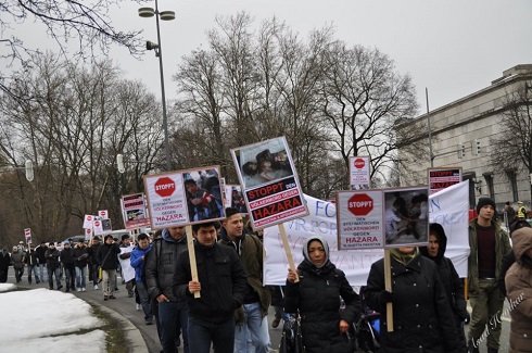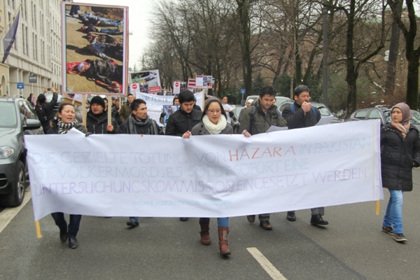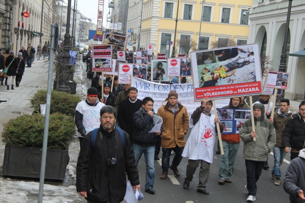 تظاهرات کنندگان در طول مسافت راه که توسط نیروهای امنیتی وپلیس محافظت میشد با سر دادن شعار های مختلف به زبانهای آلمانی وانگلیسی چون: کشتار های هدفمندانه هزاره هارا در پاکستان وافغانستان متوقف کنید وکشتار های سیستیماتیک هزاره کویته پاکستان را متوقف کنید ،وخواندن چندین بیانیه ومقاله در ارتباط با حوادث چند سال اخیر کویته پاکستان سرانجام ساعت 11,30 به ساختمان حکومتی آیالات بایرن آلمان رسیدند. ودر آنجا خواست های شان را با قرائت بیانیه،مقاله،سخنرانی وسردادن شعار ادامه دادند تا اینکه بعد از مدتی کوتاهی نماینده رسمی رئیس وزرای حکومت آیالتی بایرن آقای دکتر فیشر در جمع تظاهرات کنندگان حاضر شد وبادر دست گرفتن میکرفون گفت با عرض معذورت که رئیس وزرا با خاطر شرکت در جلسه استعفای رهبر کاتولیک جهان بیندکت 16 در واتیکان ایتالیا رفته وتشریف ندارد تا شخصا در جمع شما حاضر میشد وضمن ابراز تائسف نسبت به حوادث کویته پاکستان قول داد که خواسته های ما را که در یک نامه سرگشاده عنوان رئیس وزرائ بایرن آقای هورست زیهوفه وصدر اعظم آلمان خانم آنگیلا مرکل ووزیر خارجه آقای گیدو ویستولی بود عملی نمایند وراجع به محتوای آن که عبارت از جلوی گیری از کشتار سیستیماتیک مردم هزاره در کویته پاکستان وافغانستان وفشار آوردن به حکومت پاکستان تا علیه گروه های تروریستی اقدام جدی کند واقلیت های مردمی را بیشتر ازین قربانی منافع سیاسی خود نکند تحقیق وبررسی نمایند وبعد از مذاکره نماینده های تظاهرات کننده ها با آقای دکتر فیشر وتسلیم نامه ها به ایشان ساعت 12 ظهر تظاهرات خاتمه یافت ومردم هم هرکدام بطرف خانه هایشان متفرق شدند.