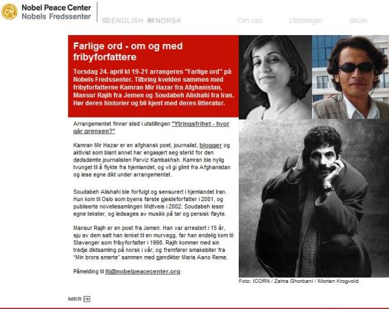 کامران ميرهزار، شاعر، نويسنده و سردبير کابل پرس?، روز پنجشنبه در مراسمی با هماهنگی سازمان آی سی او آر ان، انجمن قلم نروژ و مرکز صلح نوبل، در مرکز صلح نوبل در اسلو پايتخت کشور نروژ شعرخوانی خواهد داشت. بنا به خبر مرکز صلح نوبل او علاوه بر شعرخوانی، درباره ی وضعيت آزادی بيان در افغانستان سخن خواهد گفت. در اين مراسم ابتدا آقای يلسن، رييس انجمن قلم نروژ، کامران ميرهزار را به حاضرين معرفی خواهد کرد. پس از آن کامران ميرهزار تعدادی از شعرهايش را خواهد خواند. يکی از شاعران و روزنامه نگاران نروژ شعرهای او را که به زبان نروژی ترجمه شده است، برای حاضرين می خواند. سپس وی وضعيت آزادی بيان در افغانستان را تشريح کرده و به سوالات رييس انجمن قلم نروژ و حاضرين پاسخ می دهد. پيش از شروع اين مراسم، کامران ميرهزار گفت و گو هایی اختصاصی با برخی از روزنامه های مشهور کشور نروژ خواهد داشت.