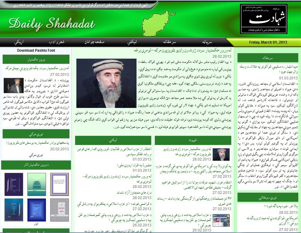 شایان ذکر است که سایت اینترنتی شهادت ارگان نشراتی افکار وعقاید گلبدین درشبکهء اجتماعی فیس بوک نیز راه پیدا کرده است ؛ تا کنون هرقدر تبصره ایکه من راجع به عکس ها وفوتوهای نصب شدهء آن صفحه ابراز داشته ام همه اش درصفحهء مذکور بلاک شده است وهرگز مجال نشر نیافته است. عناصر بداخلاق گلبدینی که همیشه دم از تعهد به آزادی بیان واظهار حق وحقیقت می زنند ولی زمانیکه پای منافع گروهی وقومی شان بمیان می آید به تمام تعهدات شان پشت پا میزنند. آزادی بیان درقاموس فاشیستان مذهبی وقومی پشتون به این معنی است که خودشان حق ابراز نظر درهرمورد را دارند ولی صدای دیگران که اگر به مخالفت شان بلند شود باید جا درجا خفه شود.