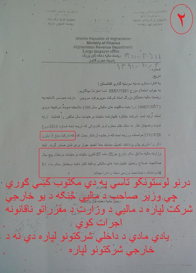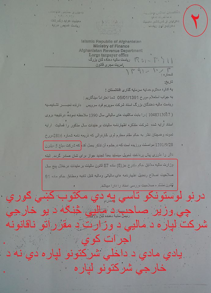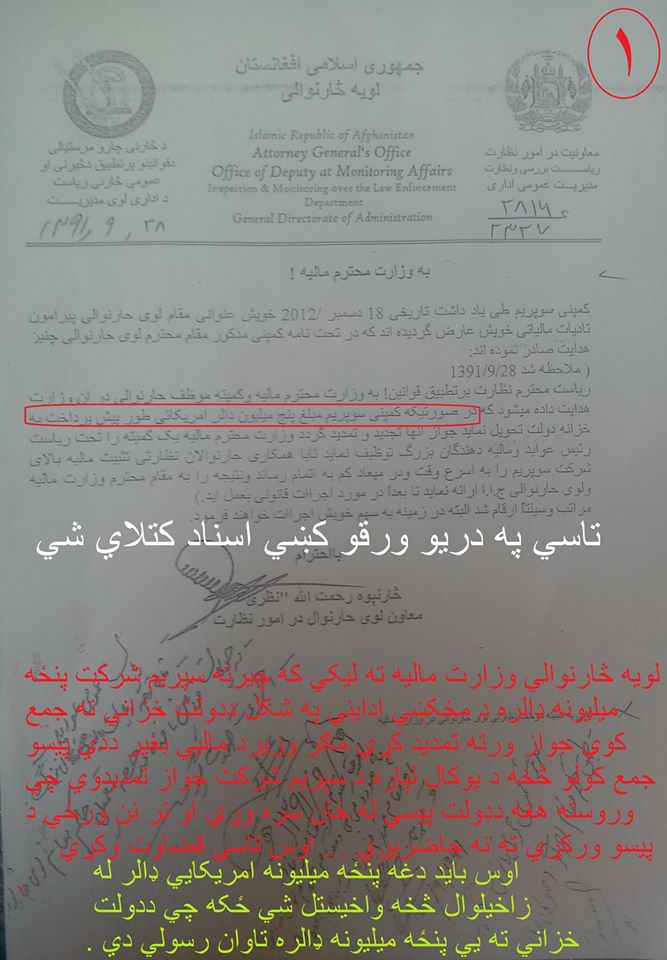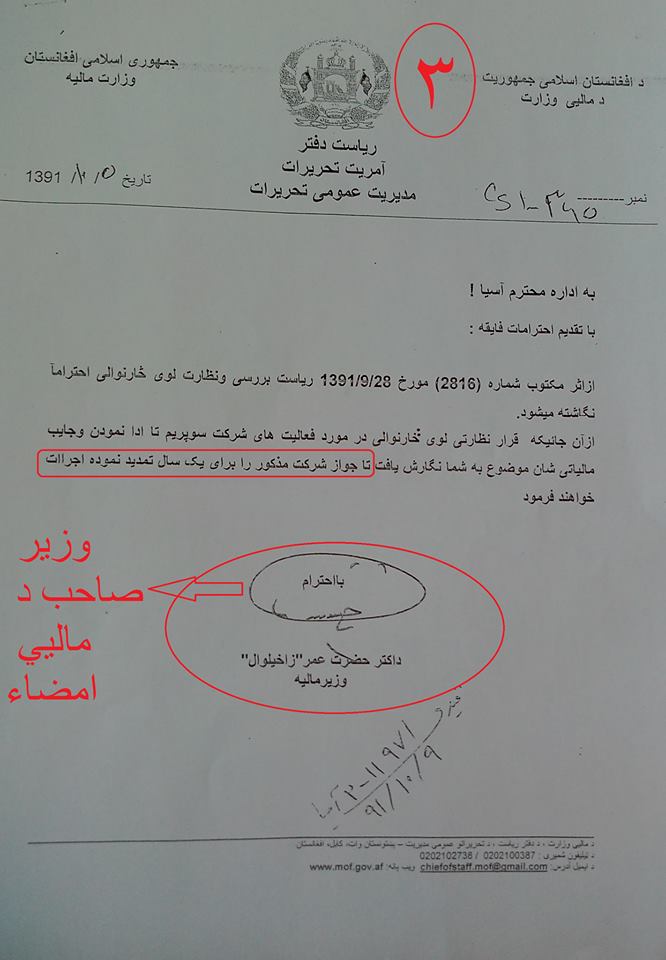 تاسي په دي مکتوبونو کښي کتلاي شي چي څنګه د افغاسنتان وزیر د ماليي یو شرکت ته چي سپریم کمپني نومیږي بغیر له دي څخه چي پنځه میلیونه امریکايي ډالر د دولت په خزانه کښي جمع کړي د یو کال تجدید نوموړي شرکت ته ورکوي چي وروسته یاد شرکت له افغانستان څخه خي او یاد پنځه میلیونه امریکايي ډالر له ځان سره وړي چي دغه پنځه میلیونه ډالر د افغانستان ملت لپاره یوه لویه ضربه ده او ددي پیسو پوښتنه باید چي د حضرت عمر زاخیلوال څخه وشي .