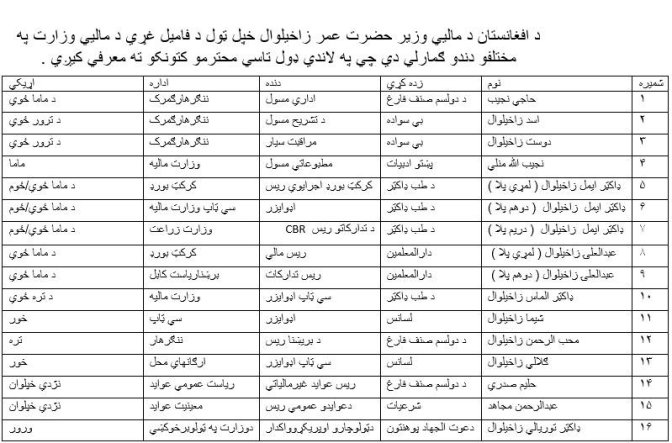 د افغانستان د ماليي وزیر حضرت عمر زاخیلوال خپل ټول د فامیل غړي د ماليي وزارت په مختلفو دندو ګمارلي دي چي په لاندي ډول تاسي محترمو کتونکو ته معرفي کیږي .