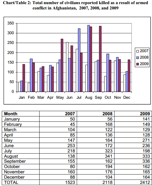 نگاهی به آمار رسمی دفتر نمایندگی سازمان ملل در کابل، از کشتار غیر نظامیان تنها در سال های 2007، 2008 و 2009 می اندازیم. همانگونه که همه می دانیم، بیشتر این غیر نظامیان در بمب گذاری ها و حملات انتحاری کشته می شوند و حتا طالبان رسمن انجام این حملات را بر عهده می گیرند. تنها در همین سه سال حداقل 6 هزار و 53 غیر نظامی کشته شده اند. بخش از غیر نظامیان توسط نیروهای بین المللی کشته شده اند و بخش زیادتر نیز توسط طالبانی که آقای سلیمان خیل می گوید بیشتر آنان کوچی هستند. در هر صورت حمله به غیر نظامیان و کشتار آنان جنایت جنگی محسوب می شود چه از سوی نیروهای بین المللی باشد و چه از سوی طالبان و کوچی طالبان.