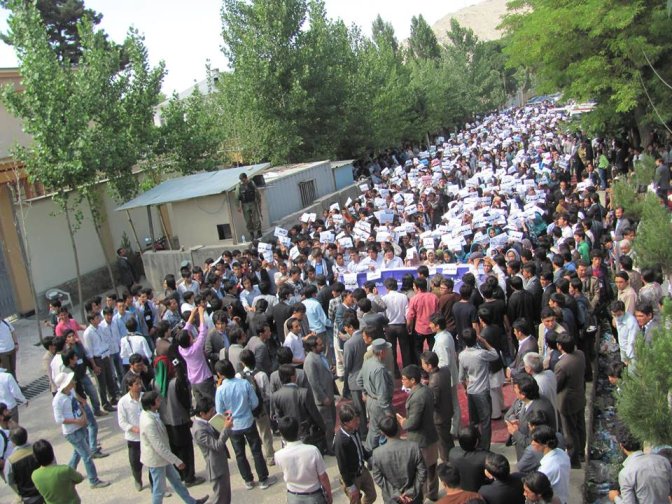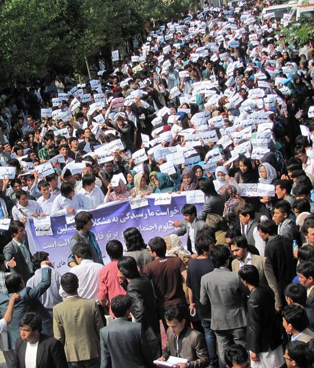 کابل پرس?: در هشتمین روز اعتصاب غذای دانشجویان در اعتراض به تبعیض نژادی در دانشگاه، هزاران دانشجو از دانشگاه های کابل، در تظاهراتی باشکوه، حمایت کامل خود را از اعتصاب کنندگان اعلام داشتند. آنان بصورت منظم و با دادن شعارهای ضد تبعیض و حمل پلاکارهایی که تبعیض را محکوم می کند، به دیدار دانشجویان اعتصاب کننده رفته اند. حضور باشکوه دانشجویان که بر تعداد آنان افزوده می شود حکومت کابل را به هراس انداخته است. حکومت؛ طرفداران ملا عمر که چندی پیش برای مخالفت با حقوق زنان شعار می دادند و همچنین رسانه های حکومتی و وابسته همچون پژواک امروز سعی داشته بصورت پلان شده، اعتصاب دانشجویان علیه تبعیض را در هم بشکنند که این طرح با شکست مواجه شده است. جنبش دانشجویی افغانستان اکنون استوار به پیش گام برداشته است و می رود تا صحنه هایی ماندگار را در تاریخ عدالتخواهی افغانستان ثبت کند.