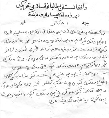 1.به تمامی آن اشخاص بی شرف و پست به شمول علماء و معلمین هشدار داده می شود که از تدریس طبقه ای اناث اکیدا خودداری کنند. بنا به اطلاعات که به ما رسیده است و مخصوصا آنانیکه نامهای شان به ما اطلاع داده شده اخطار داده می شود که از ادامه ای این عمل شیطانی جدا خودداری کنند. در صورت بی اعتنایی به این هشدار مسؤلیت پیامدش هم بدوش خود این اشخاص خواهد بود و حق هیچ گونه شکایتی هم ندارند.