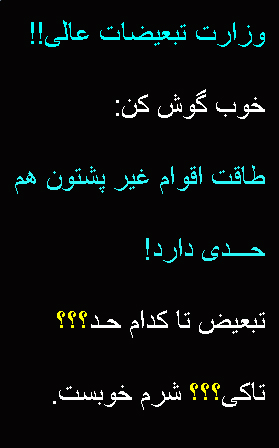 نام خراسان را گذاشتند افغانستان کاری نکردید , پشتون ها را به شمال کوچاندند کاری نکردید , زمانی که فرصت د اشتید خودمختاری اعلام کنید کاری نکردید , زبان فارسی را نیمه جان کردند کاری نکردید , سرود ملی را پشتونی کردند کاری نکردید تذکره را به پشتو نوشتند کاری نکردید ترکیب نفوس را به نفع پشتون ها تغیر میدهند کاری نمیکنید . میدانم در این دنیا پشتیبانی ندارید و دولت ایران هم با این شرایطش نخواهد توانست از مشترکات فرهنگی با شما دفاع کند / لطفا شرایط را مغتنم بدانید تا تبارتان را پشتون نکرده اند . !!!!