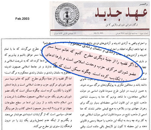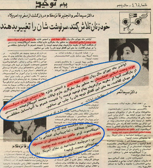 ازاین موضوع را که کسی انکار نمیکند، ایکاش کسی که این همه تلاش کرده که تاثابت کند که خانم ثمر عضو شورای حزب بوده یانه یک دفعه سری میزد به دفتر حزب وحدت در کارته سه مشکل ایشا انشأالله حل میشد. ویا ازمن میخواست که من میگفتم وفهرست اعضای شورای مرکزی حزب را دراخیارش قرار میدادم، ویا نشریه رسمی حزب وحدت را به نام امروز ما.