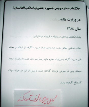 اشاره: آنچه در ادامه می آيد، يک مورد سوء استفاده در وزارت ماليه ی افغانستان می باشد که در گزارش سال 1384 رياست عمومی مستقل مبارزه با ارتشا و فساد اداری به رييس جمهور کرزی به آن اشاره شده است. اين گزارش متاسفانه در اختيار رسانه ها قرار نگرفته و کابل پرس? برای نخستين بار آن را بدون کم و کاست در اختيار افکار عمومی قرار می دهد. کابل پرس معتقد است که افشای چنين اسنادی جرم نبوده و بلکه حق مسلم مردم می باشد. برای موارد اختلاس به گزارش اين رياست، در کابل پرس بخش جداگانه ای باز شده که ما به مرور آن را نشر می کنيم.