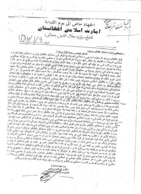 اشاره: آنچه در ادامه می آيد سندی بصورت نامه است که در ابتدای سند نام مولوی جلال الدین حقانی، يکی از سران مشهور طالبان آمده و در پای نامه امضای پسرش سراج الدين حقانی ست. اين سند توسط منبعی در امنيت ملی افغانستان که نخواست نامش فاش شود به کابل پرس? ارسال و توسط منبعی ديگر در وزارت داخله، صحت آن تاييد شده است. در اين نامه بصورت آشکار می توان اختلافات ميان سران طالبان را دريافت. در اين نامه برای نخستين بار يکی از سران طالبان با چنين لحنی ملا عمر، رهبر اين گروه را مورد انتقاد قرار داده و خواستار برکناری وی شده است.