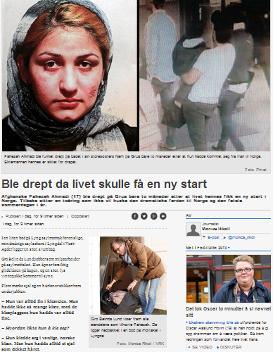 رسانه های ناروی معلومات جدیدی را درباره دختر جوانی که چند ماه پیش در ناروی به قتل رسیده بود منتشر کرده اند. فرزانه احمدی، در هنگام کشته شدن 17 سال سن داشت و همزمان مادر کودکی دو ساله بود. فائزه احمدی هراتی بود و در سن 14 سالگی بصورت اجباری به ازدواج یکی از اقوام خود درآمده بود.