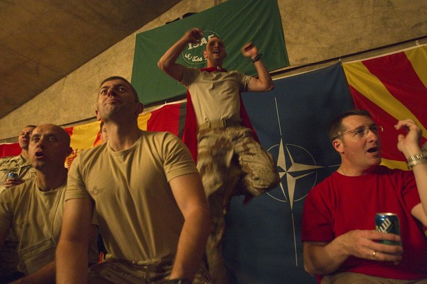 سربازان اسپانیایی و هلندی در افغانستان هنگام دیدار نهایی جام جهانی فوتبال