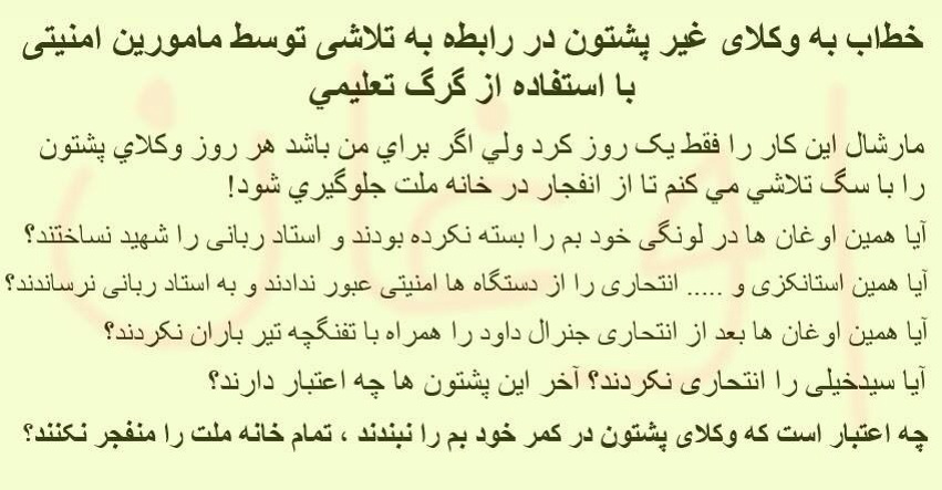 من از استخدام سگهاي تعليمي جناب محترم مارشال فهيم قهرمان ، بخاطر تلاشي وكلاي پشتون تبار ويا اوغان در پارلمان دفاع ميكنم، زيرا مردمي كه از نظر ديني به انتحار وخود مرداري باورمند باشند واز نظر قومي عمليات خودمرداري را نماد غيرت اوغاني شان تبليغ كنند ومواد انفجاري را از را مقعد به شكم خود تير كنند جز همين سگهاي مارشال فهيم قهرمان ديگر هيچ وسيله ايي براي نجات از شر انتحاري هاي پشاتين وجود ندارد