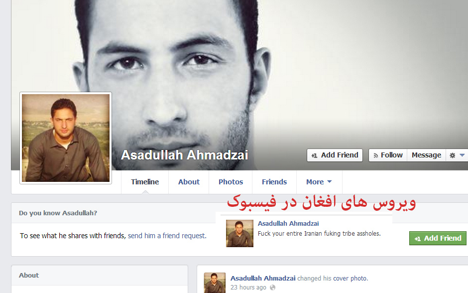 اين ويروس قهرمان افغان شجاع وبا غيرت را درفيس بوك پيدا كردم، ايشان نوشته اند كه بالفعل در كولا لامپور زنده گي ميكنند، در رشتهء اقتصاد تحصيل. كرده است، در صفحهء فيس بوكي شان هم مناجات بود وهم خرابات، هم شراب بود وهم ذكر آيات وأحاديث نبوي همراه با بعضي از ترجمه هاي آنها بزبان انگليسي، از جلوه نمائي هاي بي رقمش در تصاوير اشتباه همجنس باز ودر بدترين حالت مفعول نيز ميرود،