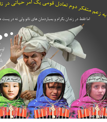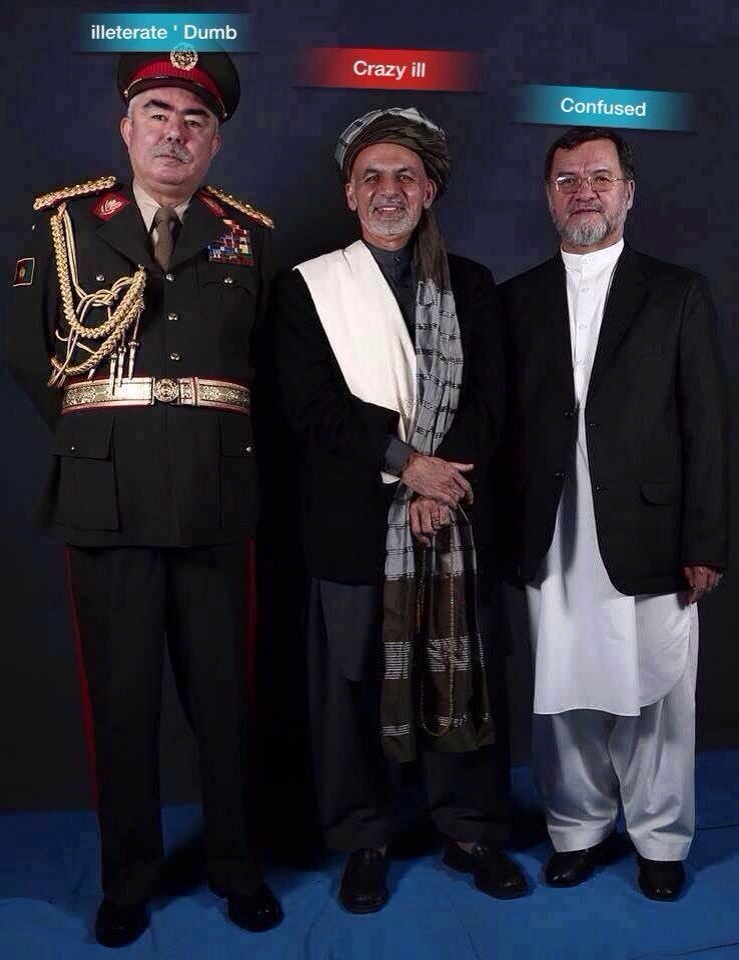 به تأييد اين طنز و كارتون زيبا ميخواهم اين موضوع را علاوه نمايم كه : تیم انتخاباتی اشرف غنی احمد زی با مشاوران وحواریون ایشان؛ روز تا روز چهره ای خطرناکتر ازخود به نمایش می گذارد. ترکیب آشکار شده در دور و بر او تاکنون شامل این طیف هاست: پشتون های متعصب با تفکرات برتری جویی وتمامیت خواهی، باورمندان فاشیسم قومی، طعنه دهنده ها وتهمت گر ها، توهین کننده ها ودشنامگو ها، زورگو ها وزور گیر ها، طرفداران حذف وطرد تاجیک ها، نامؤدب ها ومتعرض ها، ناروادارها، دزدان وقاچاقچیان شناخته شده ی متهم وپرونده دار و چندتن وکیل بدنام وبدماش وآلوده به فساد، به سکانداریِ شخصیت مرموز، علیل اما مغرور که با تفکر غریب سهمیه بندیِ زندان ها وبمب ها؛ مغز متفکراش می خوانند که غیراز تعصب آشکار قومی اش؛ دیگرنه کفرش معلوم است ونه هم دینش. ظاهر شدن خلقی های دوآتشه ووفادار به حفیظ الله امین؛ که در تکیه به عالی ترین مقام های دولتی آن زمان؛ دست شان به خون هزاران هموطن بیگناه ما آلوده است وتاکنون نیز از کرده های شان ابراز ندامت نکرده اند؛ درکنار جنرال دوستم؛ خطر آشکار دیگری ست. این چهره ها عمیق تر ازانحطاط ایدئولوژیک دیروز شان؛ امروز به لجن دروغ معروف و بی پشتوانه ی« ترکتباری» غلتیده اند. وابستگی امروز این ها به تفکرات« پان ترکیسم» تا آن حدی ست که اسمای عربی وپارسی ایرا که پدران شان بر ایشان گذاشته است و سال ها با آن اسم ها شناخته شده اند را دیگر بر نمی تابند. این ها کشتار وتصفیه ی قومی تاجیک ها توسط کریموف دکتاتور ازبک را می ستایند وحاکم مستبد ازبک را قهرمان اندیجان وفرغانه می خوانند. موجودیت شخصیت هایی با این گذشته ی منحوس وتفکرات سنگک شده ی امروز درکنار غنی و دوستم؛ زنگ خطری ست برای تاجیک
