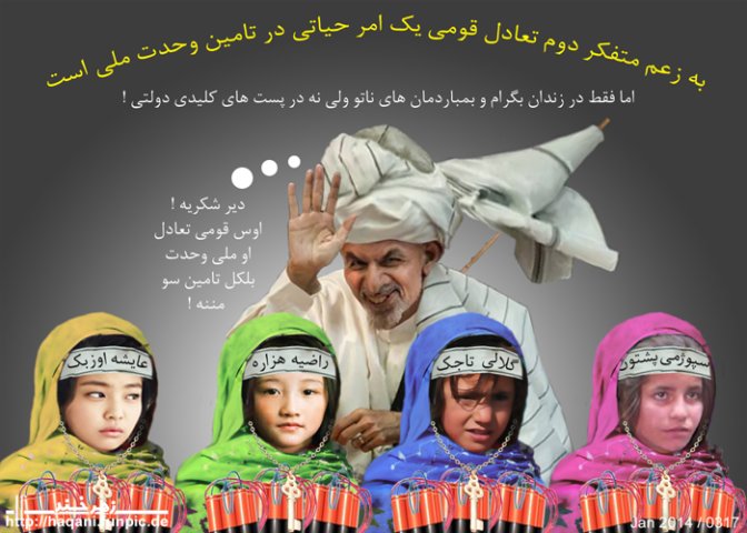 مــلا اشــرف غنــی طــالب زی متفکــر دوم درین رابطــه گفــته برای تامین تعــادل قــومی و تحکــیم وحــدت ملــی باید یک مــرد تاجــک از پنجشــیر ، یک مــرد هــزاره از بامــیان و یک مــرد اوزبک از ســمنگان خــواهــران شــان را برای عملــیات انتحــاری آمــاده ســاخــته به مــیدان جــهاد بفــرســتند در غــیر آن ایشــان به رســم اعتــراض ازین بی عــدالتــی اجتمــاعی خــود را با متفکــر ســوم جــناب اسمعــیل دون و متفکــر چــارم جــناب ابوالکنــاراب جــنرال طــاقت یکجــا در مــیدان پشــتونســتان وات منفجر کرده و صــدای اعــتراض شــان را به گــوش جهــانــیان تا انگلســتان خــواهــند رســانــید !