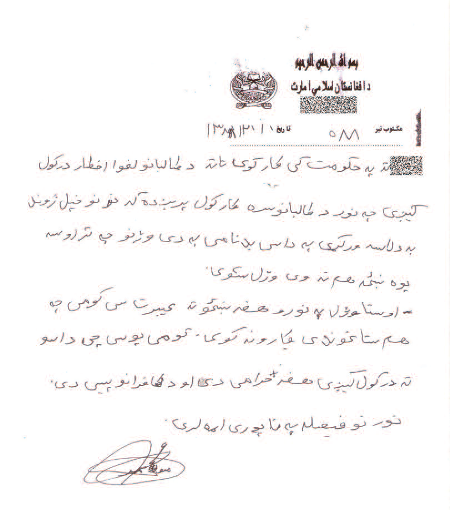 نام حذف شده است/ تو در مکتبی درس می دهی که مکتب دختران است. تو باید از خدا بترسی. ما به تو هشدار می دهیم که هر چه زودتر کارت را به عنوان آموزگار ترک کنی در غیر اینصورت سر فرزندانت را می بریم و دخترت را آتش می زنیم. تو وضعیتی را درست می کنی که پشیمان می شوی.