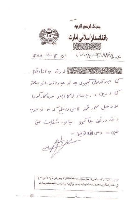 نام حذف شده است/ تو با / محل حذف شده است/ کار می کنی. به تو هشدار داده می شود که کار با آنان را رها کنی در غیر اینصورت دادگاه طالبان تصمیمی درباره تو می گیرد که سرانجام سختی برای تو و خانواده ات خواهد داشت. تو زندگی ات را از دست می دهی.