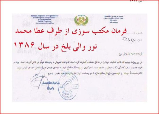 فرمان مکتب سوزی از طرف عطا محمد نور والی بلخ در سال 1386
