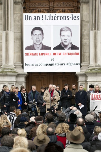 کابل پرس?: روز جمعه 13 ماه می 2011، تعداد زیادی از خبرنگاران در پاریس گرد هم آمدند و باز هم خواستار آزادی دو خبرنگار فرانسوی از چنگال تروریستان طالب شدند. آنان 500 بالن را به نشانه ی 500 روز اسارت این دو خبرنگار در چنگال طالبان، در آسمان پاریس آزاد کردند.