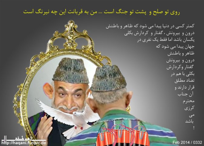 کمتر کسی در جهان پیدا می شود که که ظاهر و باطنش ، درون و بیرونش ، گفتار و کردارش بکلی یکسان باشد اما فقط یکنفری در جهان پیدا می شود که ظاهر و باطنش ، درون و بیرونش ، گفتار و کردارش بکلی با هم در تضاد مطلق قرار دارند و آن جناب محترم خجالتماب کرزی می باشد.