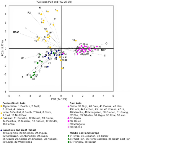 پی سی ای فریکونسی هپلوگروپ ها (شکل ا) نیز نشان دهندۀ تفاوت دربین افغان هاست. با وجودیکه مردم جهان عمدتا برحسب جغرافیه دسته بندی شده است، معلوم میشود که گروههای افغان نزدیکی/قرابت بیشتری به غیرافغان ها نسبت به همدیگرشان نشان میدهند. پشتون ها و هزاره های افغانستان و پاکستان نزدیکی بیشتری به گروههای تباری خویش در دو طرف مرز نشان میدهند. تاجیک های افغانستان عین فاصله (نزدیکی) را با آسیای مرکزی و ایران/قفقاز/روسیه غربی نشان میدهند. هزاره ها و ازبیک های افغانستان و هزاره های پاکستان دربین خوشۀ آسیای شرقی و شرق میانه/اروپا- قفقاز/روسیه غربی قرار دارند.