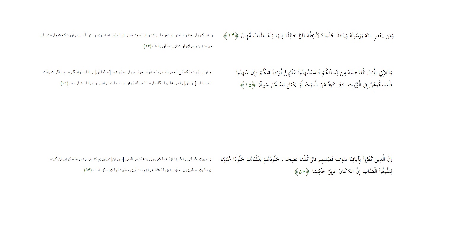 و از زنان شما كسانى كه مرتكب زنا مى‏شوند چهار تن از ميان خود [مسلمانان] بر آنان گواه گيريد پس اگر شهادت دادند آنان [=زنان] را در خانه‏ها نگاه داريد تا مرگشان فرا رسد يا خدا راهى براى آنان قرار دهد (۱۵)