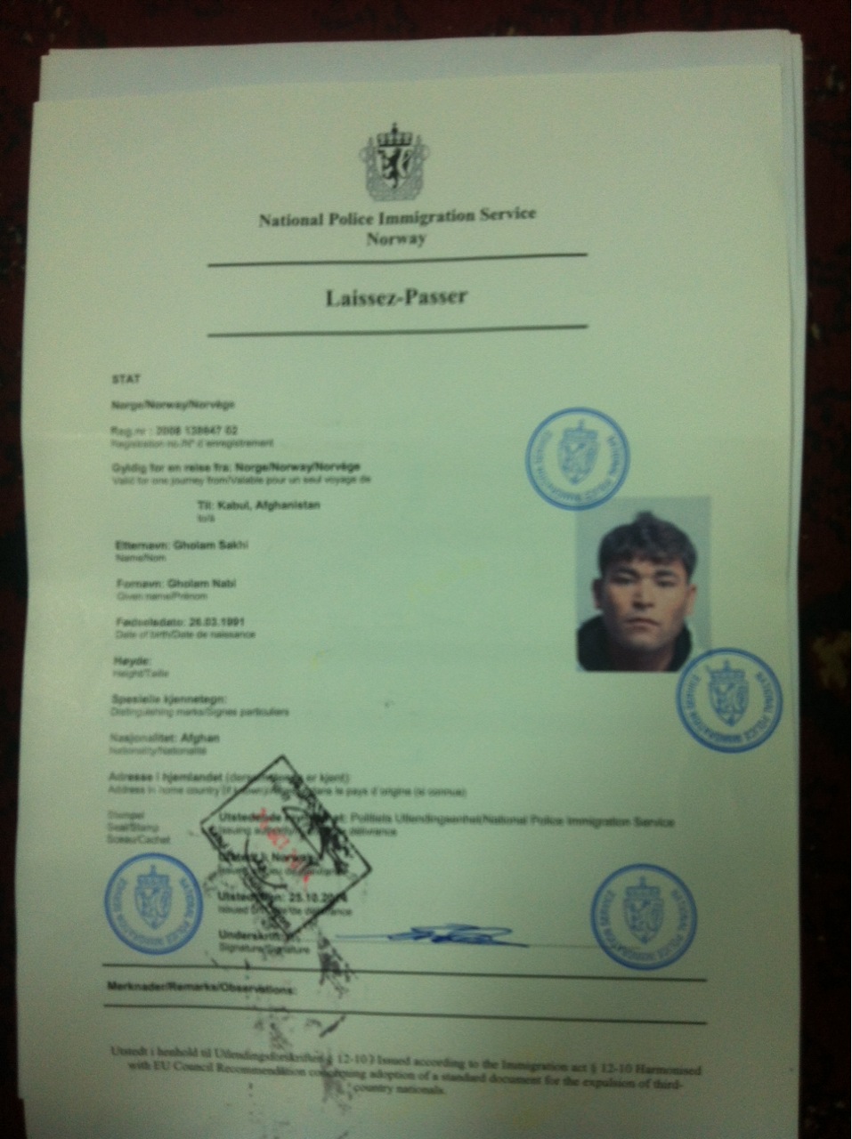 قبلاً در مورد دپورت پناهجویان شایعاتی وجود داشت که گویا سفارت افغانستان در این زمینه با پلیسهای ناروی همکاری میکند اما با اسنادی که از دپورت پناهجویان به دستم رسیده نشان میدهد که پلیس ناروی خود برگههای موقت مسافرتی میسازد و در پای این اسناد مهر و امضا، نه از خود پناهجو و نه هم از سفارت افغانستان وجود دارد.