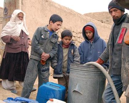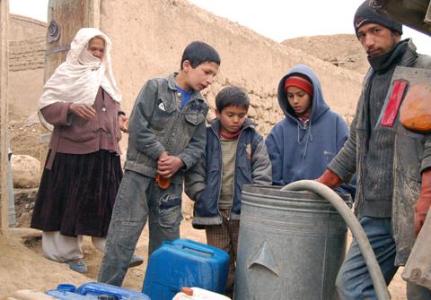 People in the Khair Khana area of Kabul buying drinking water from a private tanker.