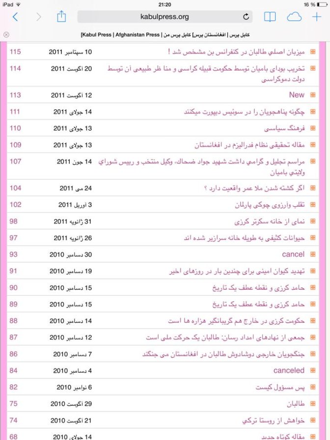 دو: تصویری که شما در بالا نشر کرده اید، بخشی از فهرست مواردی ست که بصورت مقاله/ خبر کوتاه ثبت شده اند. همانگونه که می بینید نام نویسندگان آن ها درج نمی باشد. اگر در سیستم نشر کابل پرس و در محیط خود روی عنوان موارد ثبت شده کلیک کنید می بینید که بیشتر آن ها خالی از متن و یا تصویر می باشند. در چنین مواردی نشر نیز معنایی ندارد. برای نمونه، در مورد "نمایی از خانه سکرتر کرزی" هیچ تصویری همراه با متن نمی باشد. مواردی نیز وجود دارد که شخصی بدون ثبت نام خود، مطلبی (در بیشتر موارد بسیار کوتاه) را برای نشر ثبت کرده که دیدگاه وی می باشد. اینگونه مطالب به دو دلیل نشر نمی شوند. ابتدا اینکه نویسنده آن ها مشخص نیست؛ نوشته ها دیدگاه کابل پرس نمی باشند و برای نشر باید امضایی در پای خود داشته باشند. دوم اینکه به دلیل بسیار کوتاه بودن و اینکه گاه واکنش مقابل مقاله های نشر شده می باشند، ترجیح داده می شود که ثبت کنندگان این موارد، آن ها را بصورت نظر در پای مقاله های نشر شده منتشر کنند.